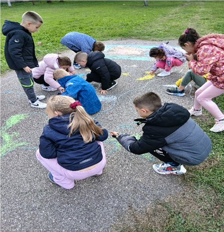 Ученици на асфалту школског дворишта приказивали тематску илустрацију обрађеног текста по избору.